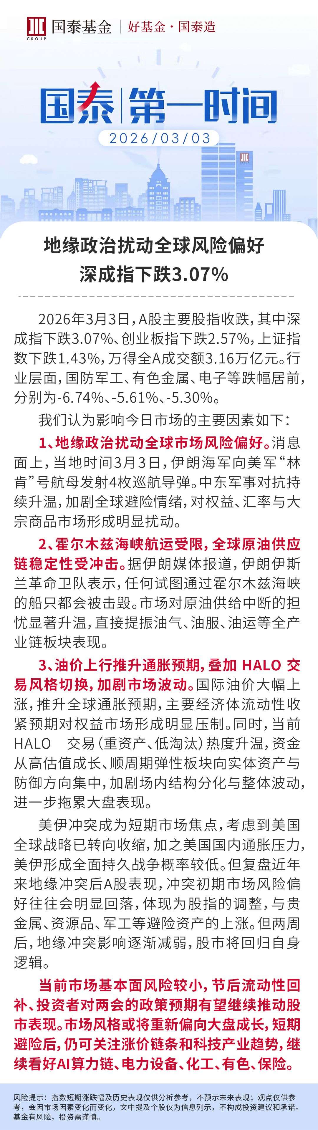 【国泰第一时间20260303】地缘政治扰动全球风险偏好,深成指下跌3.07%
