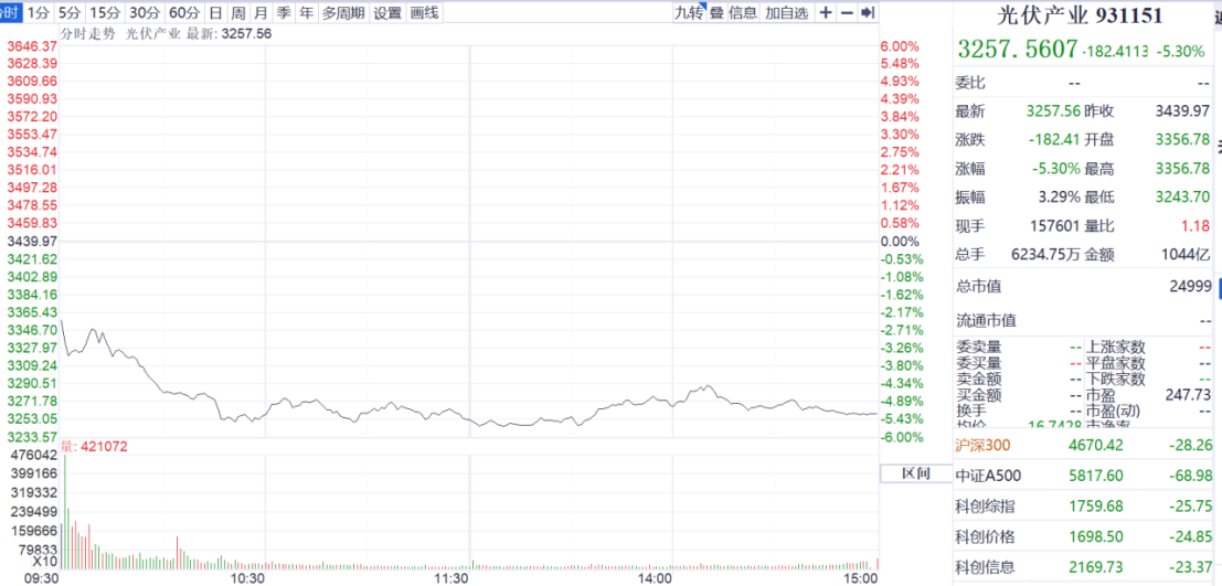 今日A股三大指数集体回调,沪指跌0.64%;深成指跌1.44%;创业板指跌1.55%;北证50指数跌2.03%。全市场成交额达2.19万亿元,较昨日有所缩量。新能源板块回调明显,中证光伏产业指数(931151.CSI)跌5.30%、恒生A股电网设备指数(HSCAUPG.HK)跌4.78%。