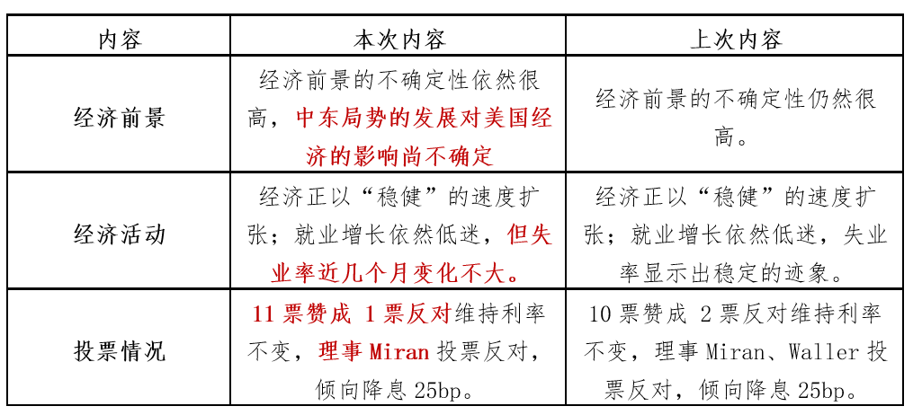 本次利率决定和会后表述较鹰派,鲍威尔强调尚不确定中东局势对经济影响,若看不到通胀回落则不会降息,点阵图分布中位数仍指向年内降息一次,但边际偏鹰。