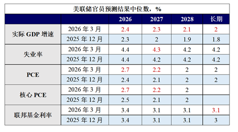 3.PCE与核心PCE:2026年PCE及核心PCE预测分别大幅上修0.3和0.2个百分点,均达到2.7% ;2027年两项通胀预测均上修0.1个百分点至2.2%。